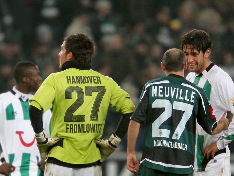 Mönchengladbachs Oliver Neuville tröstet Hannovers doppelten Eigentorschützen Karim Haggui, rechts. Daneben steht Hannovers Torwart Florian Fromlowitz.