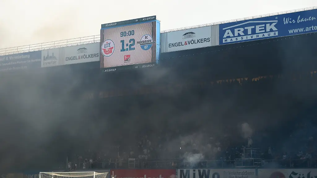 Kurz vor dem Ende der Partie gegen den SC Paderborn hatten Fans Böller und Pyros gezündet und einige auch aufs Spielfeld geworfen. Schiedsrichter Harm Osmers schickte die Mannschaft trotz der vier zu spielenden Minuten zunächst in die Kabine. Vereinzelt gab es unter den 26.000 Zuschauern im ausverkauften Ostseestadion Protestrufe gegen die gewaltbereiten Anhänger.