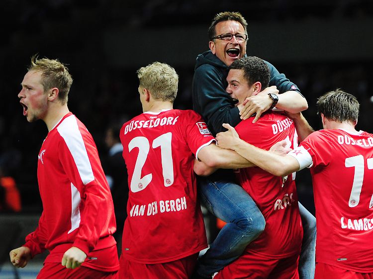 Nur die 22 Fortuna-Spieler und Trainer Norbert Meier wollen nichts davon wissen. Kapitän Andreas Lambertz, der schon in der 4. Liga für die Fortuna spielte, drohte sogar: "Wenn einer denkt, wir wären aufgestiegen, dem springe ich seitlich ins Knie!" Es gehe ihm "tierisch auf den Sack, dass alle schon denken, wir sind bereits in der Bundesliga".