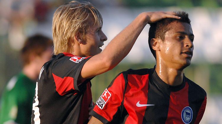 Gut gemacht: Herthas Marc Stein gratuliert dem Kollegen Cicero zu seinem Tor in Budapest.