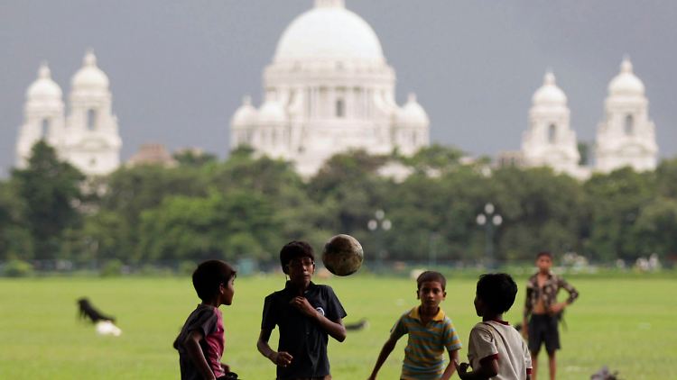 Fußballspielende Kinder vor dem Victoria-Memorial in Kalkutta: Das Potenzial des indischen Fußballs gilt als weitgehend unerschlossen.