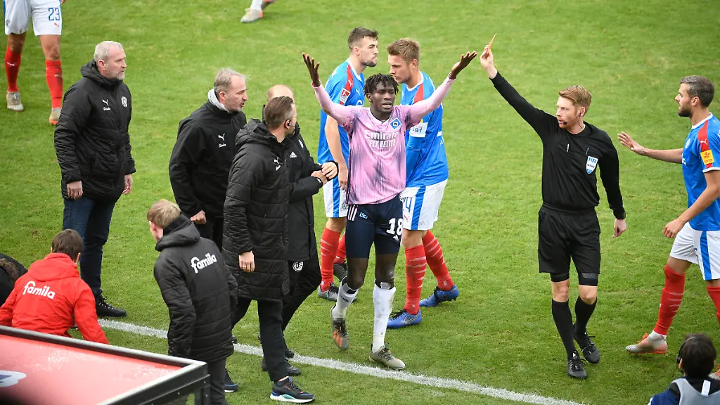 Der HSV muss nach dem fünften Spiel in der Fremde ohne Erfolg allerdings um seine Tabellenführung fürchten. Schon am Sonntag kann Arminia Bielefeld mit einem Erfolg beim 1. FC Nürnberg vorbeiziehen. Die Hamburger setzten von Beginn an die Kieler unter Druck und hätten schon früh durch Sonny Kittel (2.) in Front gehen können. Die Kieler verlegten sich aufs Kontern. Auch nach Jattas Platzverweis veränderte sich das Spielgeschehen zunächst kaum. Kiels Serra nutzte dann eine Fehlerkette in der HSV-Defensive zu seinem dritten Saisontreffer. Die Hamburger hatten auch nach dem Wechsel ein spielerisches Übergewicht. Aber die Gäste kamen kaum gefährlich vor das Tor der cleveren Kieler - bis zur Nachspielzeit: Nach einem Eckball gelang Letschert doch noch der gerechte Lohn für die HSV-Bemühungen.