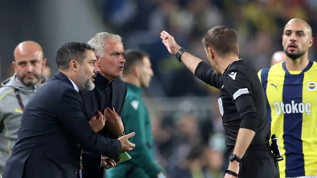 Was war passiert? Beim Stand von 1:1 zwischen United und Fenerbahçe hatte Schiedsrichter Clement Turpin den Gästen aus der türkischen Metropole in der 57. Minute einen Elfmeter verweigert. Uniteds Manuel Ugarte hatte in einem Zweikampf Bright Osayi-Samuel getroffen. Elfmeterwürdig, fand Mourinho. Nicht elfmeterwürdig, fand Turpin. Der als Schiedsrichter entscheiden durfte. Und den zeternden Trainer direkt noch auf die Tribüne verbannte.