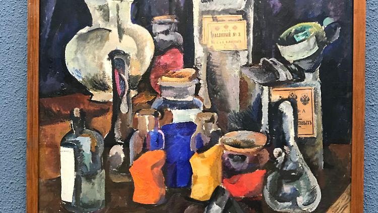 "Dopingkontrolle" (Pjotr Kontschalowski, 1913, Öl und Collage auf Leinwand). Zahlreiche bereits vorgefüllte Gefäße, einige von ihnen in Farben, die der menschliche Körper nicht in der Lage ist, selber zu produzieren. Kontschalowski bewegt sich gekonnt im Grenzbereich zwischen unausweichlicher Körperlichkeit und philosophischen Konzepten wie Ethik und Gerechtigkeit.