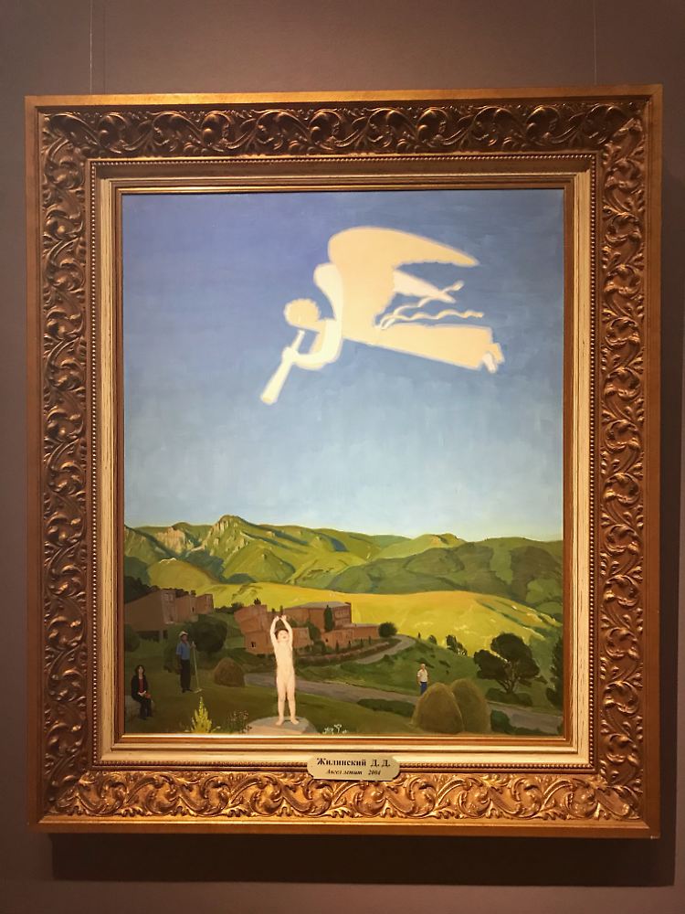 "Gottes Vuvuzela" (Dmitri Schilinski, 2004, Tempera auf Pappkarton). Der Maler zeigt den Fußballfan als Apotheose kindlicher Reinheit und Unschuld. Die Botschaft ist klar: Gottes Gesetz gilt mehr als die Regeln der Fifa - und bricht so auch das Vuvuzela-Verbot in den russischen WM-Stadien.