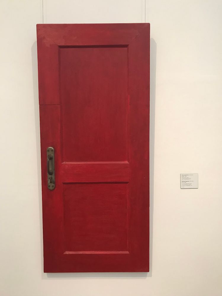 "Die Zukunft des Stanislaw Salamowitsch" (Michail Roginski, 1965, Öl auf Holz mit metallener Klinke). Lackiert in der Signalfarbe Rot, ist dieses Objet trouvé in direktem Bezug zur Roten Karte zu sehen. Der Künstler reklamiert für sich die Rolle des Schiedsrichters und gibt als solcher eine Prognose ab zur Perspektive des russischen Nationaltrainers über das Turnier hinaus.