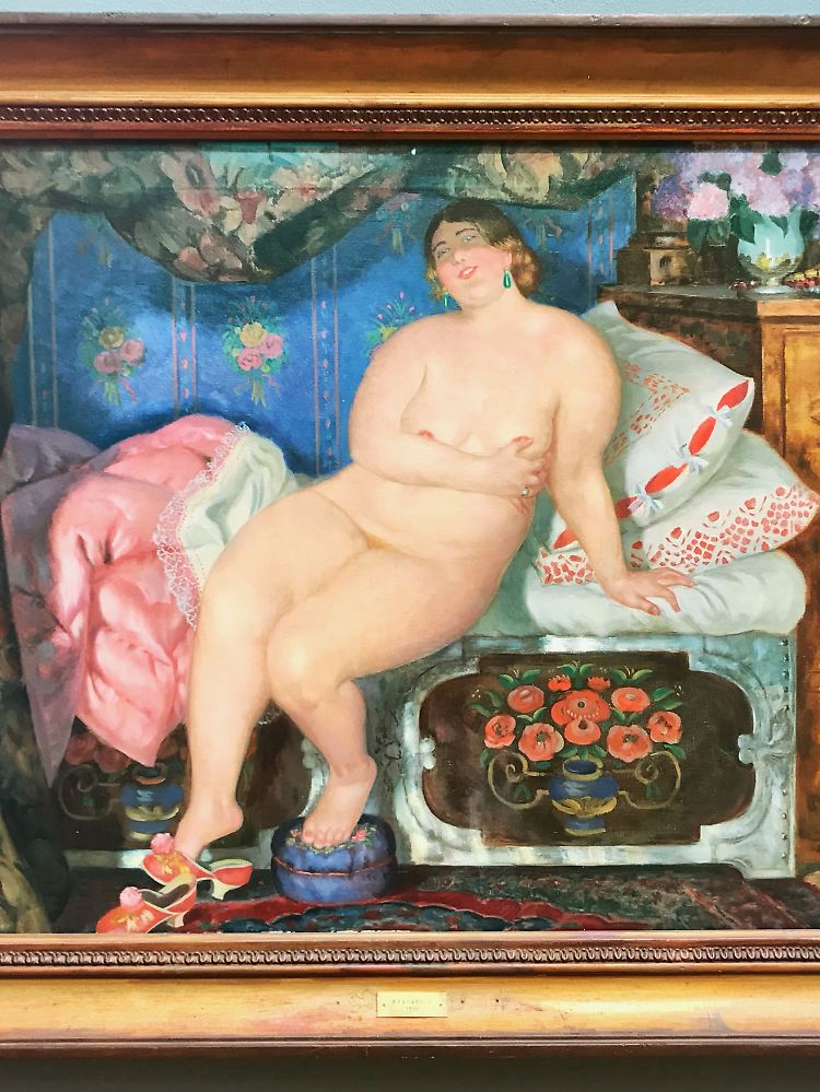 "VIP-Lounge" (Boris Kustodiew, 1921, Öl auf Leinwand). Ein weiblicher VIP lockt sirenengleich den Betrachter, sich in ihren Anblick zu vertiefen. Der Künstler nötigt damit den Rezipienten in eine ähnliche Situation, wie sie die Frau in der opulent dekorierten Lounge erlebt: Keine von beiden hat Interesse oder auch nur Gelegenheit, das Spielgeschehen zu verfolgen.