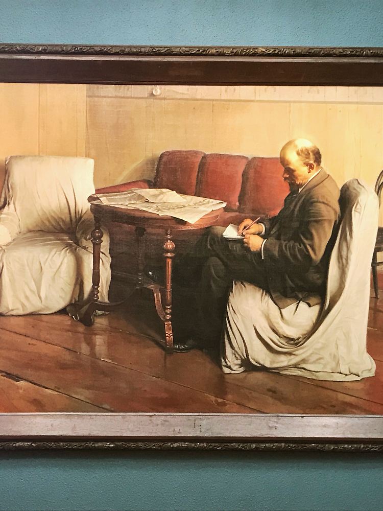"Lenin beim Tippspiel" (Isaak Brodski, 1930, Öl auf Leinwand). Der Revolutionär wird hier in privater Pose gezeigt. Gleichzeitig spielt das Werk gekonnt mit Gezeigtem und nicht Gezeigtem: Die Ausrichtung der Möbel ermöglicht es dem Betrachter, zu schlussfolgern, wo in Lenins Wohnzimmer der Fernseher steht.