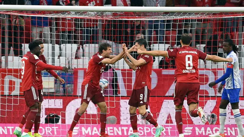 Bevor die Gala von Lewandowski und das 3:0 des von den Zuschauern ebenfalls lautstark gefeierten Jungstars Jamal Musiala folgten, hatte Müller den Torreigen gegen die Berliner eröffnet. Auch er sieht den 33-jährigen Lewandowski "auf dem nächsten Level" angekommen. Der ewig hungrige Torgigant gönnt nun auch anderen Tore, wie das 1:0 belegte, als er ein Zuspiel passieren und dem hinter ihm postierten Müller überließ. "Es gab schon Jahre, da hat er den Ball mitgenommen und es selbst versucht", staunte Müller - und frotzelte: "Ich habe nachgefragt, ob er nicht fit ist, oder ob er das nächste Level erreicht hat, weil er jetzt auf einmal Bälle im Strafraum für einen besser Postierten durchlässt", erklärte Müller bei "Sky" und ergänze ernsthaft: "Er merkt ja, dass wenn er selbstloser spielt, dass er von uns trotzdem bedient wird und er seine Tore macht", ergänzte Müller und stellte fest: "Das ist das Verrückte, dann macht er im Vorbeigehen einen Hattrick." Lewandowski traf gegen die Berliner noch zum 2:0, 4:0 und 5:0 - und stellte einen neuen Vereinsrekord auf: Als erster Bayern-Profi überhaupt traf er in 16 Pflichtspielen in Serie.