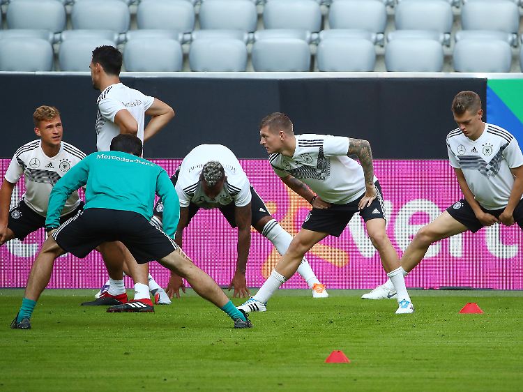 Das hat der Bundestrainer nicht verraten, auch das hat sich nicht geändert. Es ist davon auszugehen, dass Löw gegen Frankreich auf die fünf Spieler setzt, die beim Titelgewinn 2014 zu den Stützen gehörten und dabei eventuell vom tradierten 4-2-3-1-System auf ein 4-3-3 umstellt. Allerdings hat Löw betont, defensive Stabilität sei nicht in erster Linie eine Frage des Systems, sondern hänge davon ab, dass alle Spieler Aufgaben in der Abwehr übernähmen. Manuel Neuer jedenfalls steht im Tor, Jérôme Boateng und Mats Hummels bilden die Innenverteidigung und Thomas Müller kommt auf der rechten Außenbahn zum Einsatz. Sie alle spielen beim FC Bayern. Hinzu kommt Toni Kroos von Real Madrid, der vor der Viererabwehrkette agiert und dort mutmaßlich von Ilkay Gündogan von Manchester City und dem Münchner Leon Goretzka unterstützt wird. "Es ist doch klar: Diese Spieler haben eine absolute Qualität. Und natürlich erwarte ich von ihnen, dass sie den Karren jetzt anschieben." Kimmich wird wieder den Posten als rechter Außenverteidiger bekommen. Da Jonas Hector vom 1. FC Köln nach Absprache mit Löw nun doch nicht dabei ist, könnte der Hoffenheimer Niko Schulz einspringen, der zum allerersten Mal dabei ist. Auch Thilo Kehrer von Paris Saint-Germain, ebenfalls ein Neuling, ist eine Option. Marco Reus von Borussia Dortmund dürfte auf der rechten Seite stürmen, in der Mitte Timo Werner von RB Leipzig.