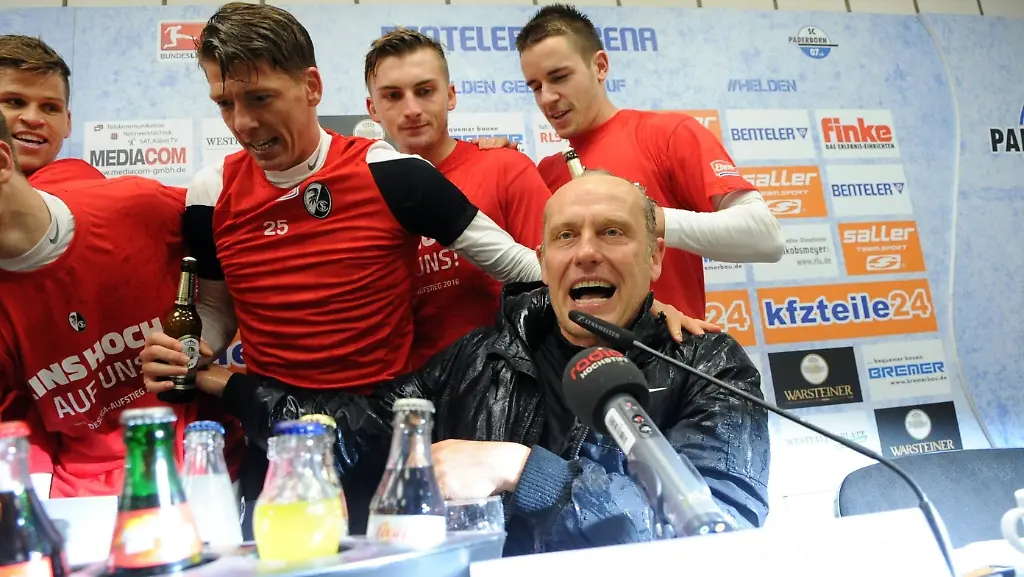Der sofortige Wiederaufstieg schon am 32. Spieltag in Paderborn perfekt, die Spieler stürmen euphorisiert die Pressekonferenz ihres Trainers, und was macht dieser Christian Streich? Er schickt seine Spieler zurück in den Kabinentrakt. "Haut ab, der andere Trainer muss noch was sagen, die kämpfen gegen den Abstieg."