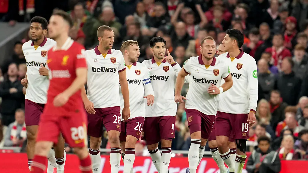 Ohne seinen verletzten deutschen Nationalstürmer Niclas Füllkrug hat der Londoner Klub West Ham United die nächste deutliche Niederlage kassiert. Die "Hammers" flogen in der 3. Runde mit 1:5 (1:1) beim FC Liverpool aus dem englischen Liga-Pokal. Ein Eigentor von Jarell Quansah brachte West Ham in der 21. Minute in Führung. Danach trafen der Portugiese Diogo Jota (25./49.), der Ägypter Mohamed Salah (74.) und der Niederländer Cody Gakpo (90.(90.+3) für die "Reds". West Hams Edson Alvarez sah noch die Rote Karte (77.).