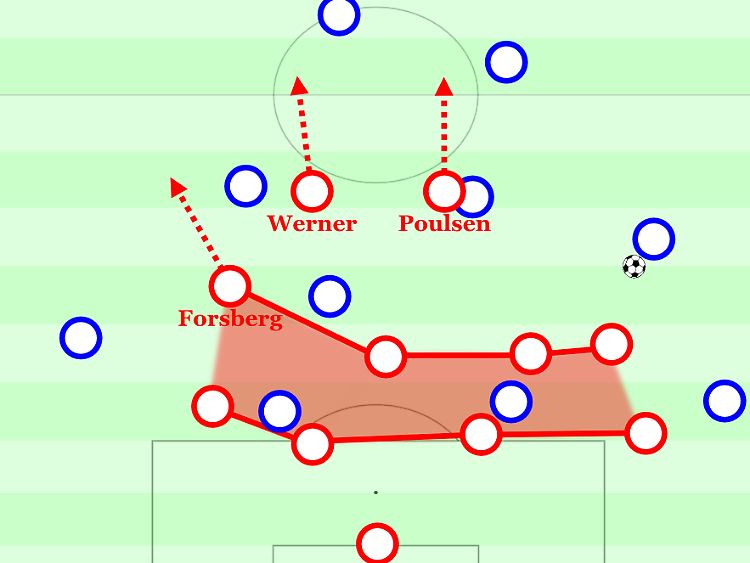 Vor den beiden Ketten warten in der Regel die zwei zentralen Angreifer - manchmal stehen sie tief, manchmal lassen sie ein Loch. Nach Balleroberungen soll das Spielgerät schnell zum offensiven Dreh- und Angelpunkt Yussuf Poulsen gelangen. Der Däne kann mit seinem Körper den Ball abschirmen und die quirligen Nebenmänner anspielen. Gerade Marcel Sabitzer und Emil Forsberg sind starke Dribbler. Neuzugang Timo Werner hingegen kommt vor allem über seine Beschleunigung zum Tragen. Der Ex-Stuttgarter unternimmt viele Läufe hinter die gegnerische Verteidigungslinie, um dort den Ball in Empfang zu nehmen. Ähnliche Qualitäten bringt auch das schottische Talent Oliver Burke mit, das sich langsam an die erste Elf herantastet.