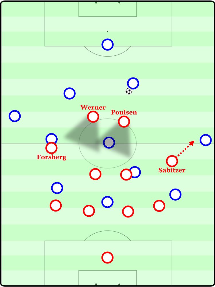 An der Mittellinie üben beide zentralen Angreifer leichten Druck auf den Ballführenden aus, während sie die gegnerische Anspielstation im Zentrum in den Deckungsschatten stellen. Beide Flügelstürmer schieben flexibel zu ballnahen Gegenspielern (hier Forsberg) oder belauern Passwege und mögliche Passempfänger (hier Sabitzer).