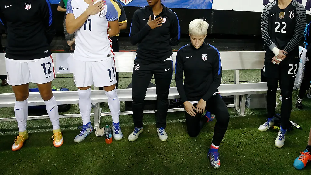 Megan Rapinoe kniet während der Hymne - eine Respektlosigkeit. So sieht es der amerikanische Fußball-Verband und erlässt im Jahr 2016 eine Bestimmung, wonach alle Teams "respektvoll stehen sollen." Diese soll nun endlich wieder gekippt werden, fordern die US-Fußballerinnen.