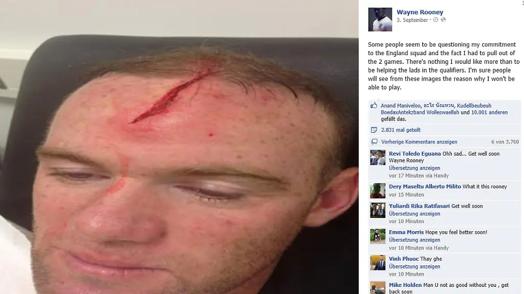 Stürmer Wayne Rooney hat mit der Veröffentlichung drastischer Fotos auf die Diskussion um seine angeblich mangelnde Hingabe für die englische Fußball-Nationalmannschaft reagiert. Der Profi von Rekordmeister Manchester United stellte zwei Bilder auf seine Facebook-Seite, die die tiefe Platzwunde auf seiner Stirn zeigen. Wegen der Wunde hatte er seine Teilnahme an den Länderspielen der Three Lions absagen müssen.