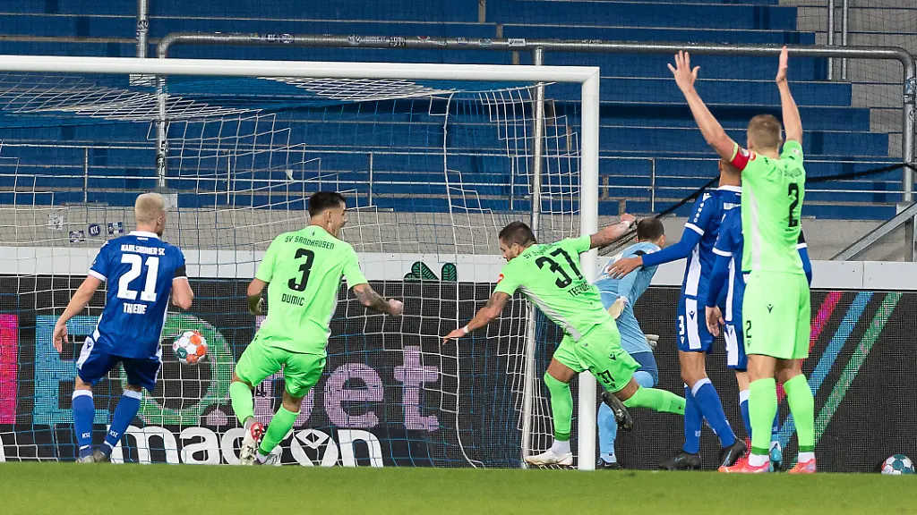Für den SVS, der den zweiten Sieg nacheinander einfuhr, trafen Pascal Testroet (45. +2) und sechs Minuten vor dem Ende Jerome Gondorf mit einem Eigentor. Das Südwest-Duell war wegen zahlreicher Corona-Fälle beim KSC verschoben worden. Der KSC hatte die größeren Spielanteile, Chancen blieben allerdings Mangelware. Und schon in der Anfangsphase präsentierten sich die Gäste selbstbewusst. Zunächst war an KSC-Schlussmann Marius Gersbeck aber noch kein Vorbeikommen. Testroet scheiterte doppelt (15./19.).