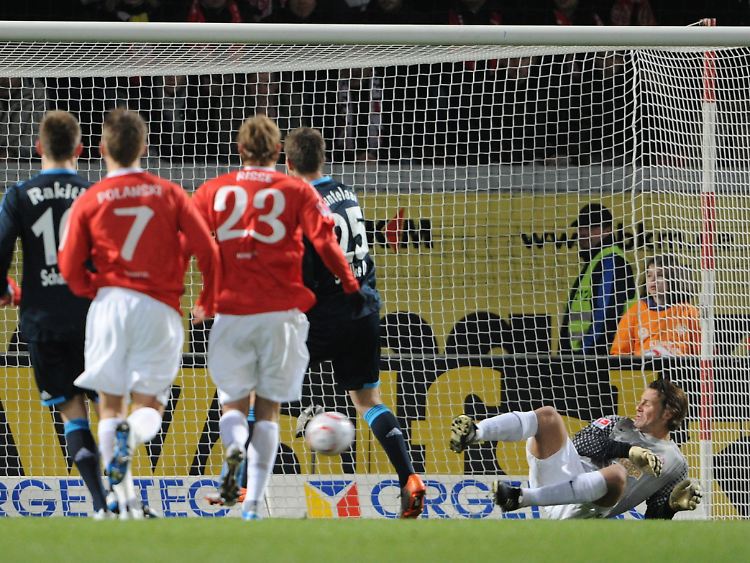 Schon die Anfangsphase hatte es in sich. Chancen auf beiden Seiten und der erste Aufreger in der achten Minute: 05-Verteidiger Christian Fuchs foulte an der Strafraumgrenze fast in Höhe der Grundlinie Farfán, Schiedsrichter Felix Brych (München) pfiff Strafstoß. Alle Mainzer Proteste halfen nichts, dafür stand das Glück den Gastgebern zur Seite. Huntelaar schoss den Ball vom Elfmeterpunkt an den linken Innenpfosten, von dort sprang der Ball an den Rücken von Christian Wetklo und dann ins Aus statt ins Tor. Wetklo, der sich noch lange nicht über den Strafstoß beruhigt hatte, sah danach die Gelbe Karte wegen Reklamierens.