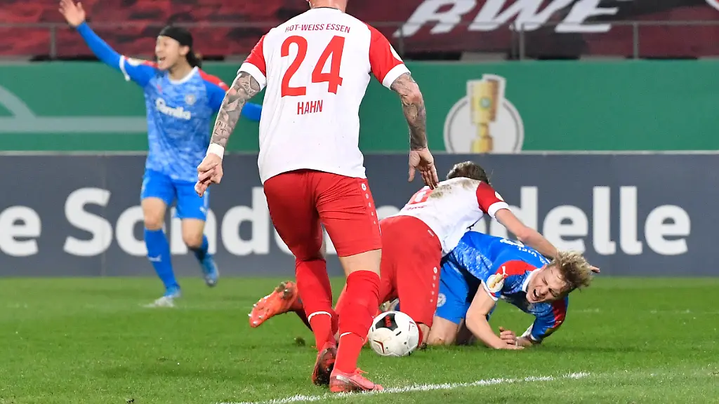 Wieder mal wird über den Videoschiedsrichter diskutiert. Und dieses Mal herrscht reichlich Wut über dessen Untätigkeit. Zumindest im Lager von Regionalligist Rot-Weiss Essen, der sich im Pokal-Viertelfinale dem Zweitligisten Holstein Kiel mit 0:3 (0:2) beugen musste. Und tatsächlich war die Szene in der 26. Minute maßgeblich für den Spielverlauf, denn es gab Elfmeter für die Norddeutschen. Was in Echtzeit nach einer klaren Angelegenheit aussah, wurde mit jeder Zeitlupe immer zweifelhafter. Zwar hatte der Essener Dennis Grote seinen Gegenspieler Finn Porath tatsächlich berührt - aber auch gefoult? Eigentlich nicht. Porath war schon zuvor zu Boden gesunken.
