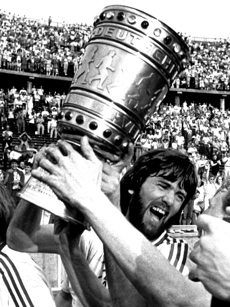 Der Uerdinger Friedhelm Funkel reckt am 26. Mai 1985 jubelnd den DFB-Pokal in die Höhe.