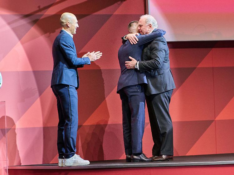 "Uli Hoeneß, du bist der beste Mann", schallte es durch die Halle. Bei pompösen Klängen trugen die nicht mehr für den FC Bayern aktiven Topspieler Franck Ribéry (AC Florenz) und Arjen Robben (Karriereende) Meisterschale und DFB-Pokal auf die Bühne. Basketball-Geschäftsführer Marko Pesic brachte deren Meistertrophäe mit. Es folgten herzliche Umarmungen mit Hoeneß. Die Überraschung sei geglückt, schwärmte Hoeneß. Frenetisch gefeiert wurde auch Oliver Kahn, der an der Seite von Sportdirektor Hasan Salihamidzic applaudierte. Der frühere Kapitän und Torhüter Kahn wird im kommenden Jahr Vorstandsmitglied und soll dann zum Nachfolger von Karl-Heinz Rummenigge als künftiger Chef aufgebaut werden. Kahn genoss den Riesenjubel - von Hoeneß bekam er schon vor dem Amtsantritt Aufgaben mit auf den Weg. "Da hast du viel Arbeit, um diesen Vorschusslorbeeren gerecht zu werden", erklärte Hoeneß. Den "Bis-auf-Weiteres"-Coach Hansi Flick begrüßte Hoeneß als "Cheftrainer". "Wer den Mitgliedern so ein wunderbares Fußballspiel wie Samstag schenkt, hat diesen Beifall verdient", sagte Hoeneß.