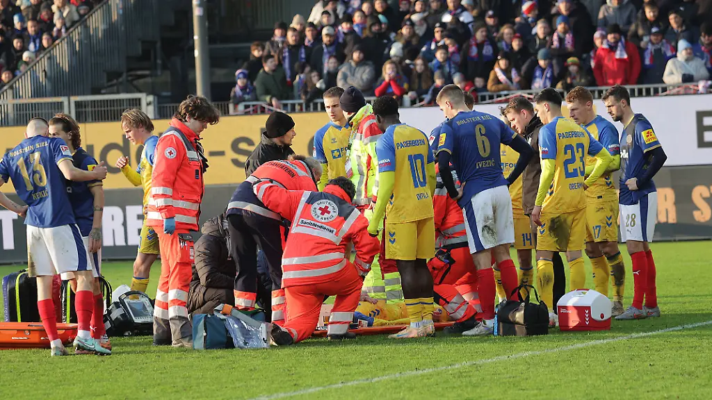 Eine schwerwiegende Verletzung überschattete den Sieg von Holstein Kiel gegen den SC Paderborn. Bei einer Flanke nach etwa 88 Minuten kam Paderborns Calvin Brackelmann in einem Luftduell mit dem Nacken denkbar unglücklich auf dem Boden auf und blieb benommen liegen. Der 26-Jährige wurde etwa zehn Minuten von medizinischen Kräften und abgeschirmt von seinen Kollegen behandelt. Stille machte sich im Stadion breit, ehe der Spieler unter Beifall aus dem Stadion abtransportiert wurde.