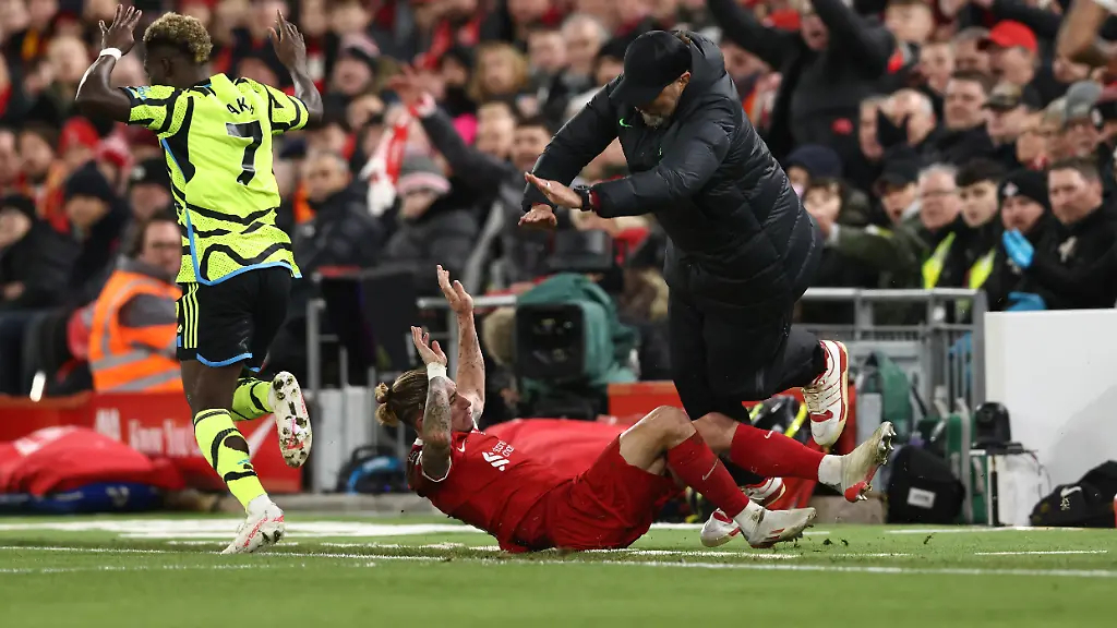 Dann war auch Klopp plötzlich mittendrin im Geschehen. Nach einem Körpereinsatz von Arsenal-Stürmer Bukayo Saka an Liverpool-Defensivspieler Kostas Tsimikas brachte der Grieche den deutschen Trainer zu Fall. Tsimikas musste danach wegen einer Schulterverletzung ausgewechselt werden. Nach dem Seitenwechsel verpasste Liverpool den Siegtreffer: Trent Alexander-Arnold traf nach einem Konter nur die Latte des Arsenal-Tores (73.).