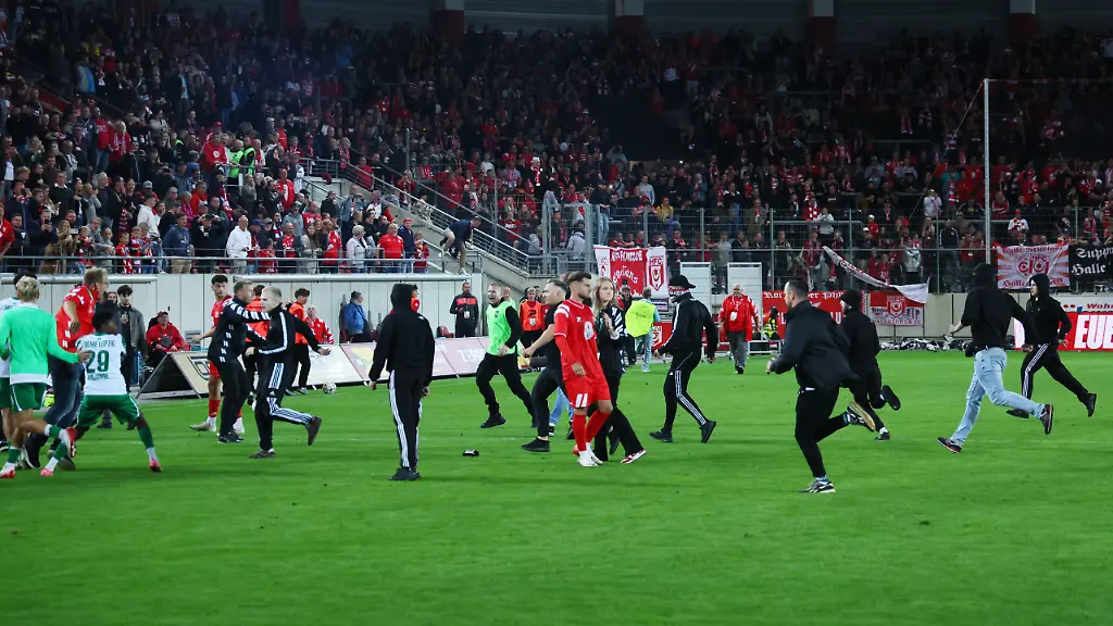 Nach dem Schlusspfiff der Partie fliegt zuerst Pyrotechnik aus dem Gästeblock in Richtung der Heimfans. Teile der Halle-Anhänger stürmen über den Platz in Richtung der Gäste und versuchen, diese zu attackieren. Die Gastmannschaft, die mit den mitgereisten Fans das Unentschieden feiert, bekommt davon erst einmal nichts mit. Dann kommt es auch zu Konfrontationen zwischen den Fans und Spielern. Die Polizei ist zuerst nicht Herr der Lage. In diesem Chaos zwischen jagenden Halleschen Fans, überrumpelten Polizisten und flüchtenden Fußballern sollen die Leipziger Spieler Valon Aliji und Philipp Wendt "unsportliches Verhalten" gezeigt haben - entsprechend hängt nun eine Sperre durch den NOFV über ihnen.