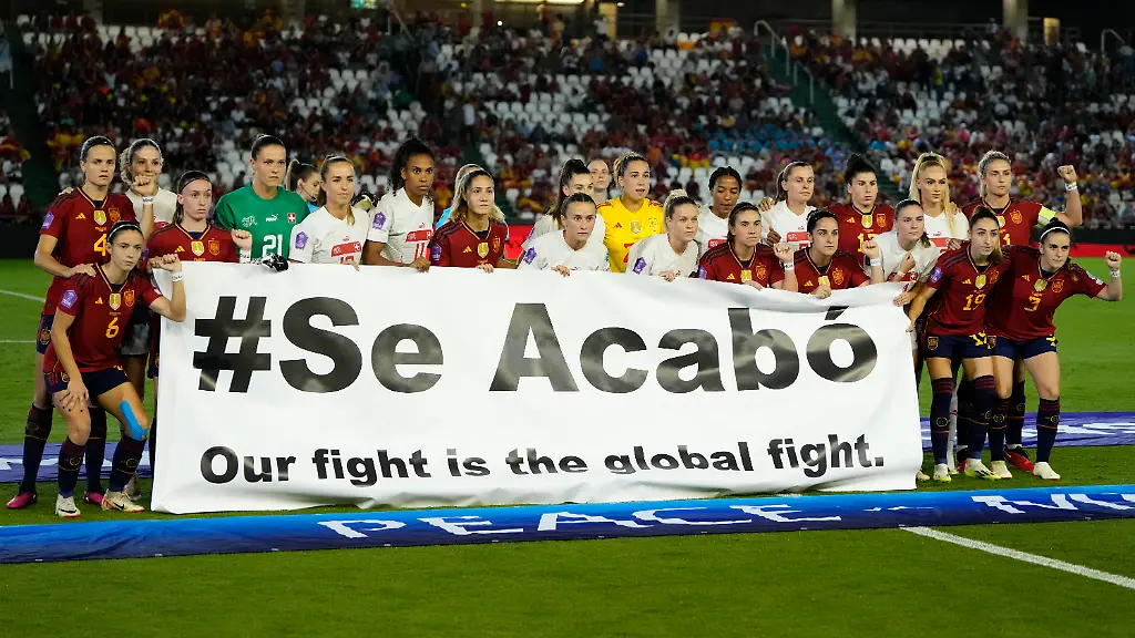 Die spanischen Nationalspielerinnen haben in der Nations League erneut mit starken Botschaften ihre Solidarität mit ihrer Mitspielerin Jennifer Hermoso nach dem Rubiales-Skandal ausgedrückt. Auch vor dem 5:0 am Dienstagabend gegen die Schweiz posierten die Spielerinnen beider Nationen hinter einem großen Banner mit der Aufschrift. "Se Acabó - Our fight is the global fight" - in etwa: "Es ist vorbei - unser Kampf ist der Kampf aller". Die spanischen Spielerinnen trugen die "Se Acabó"-Botschaft zudem am Handgelenk.