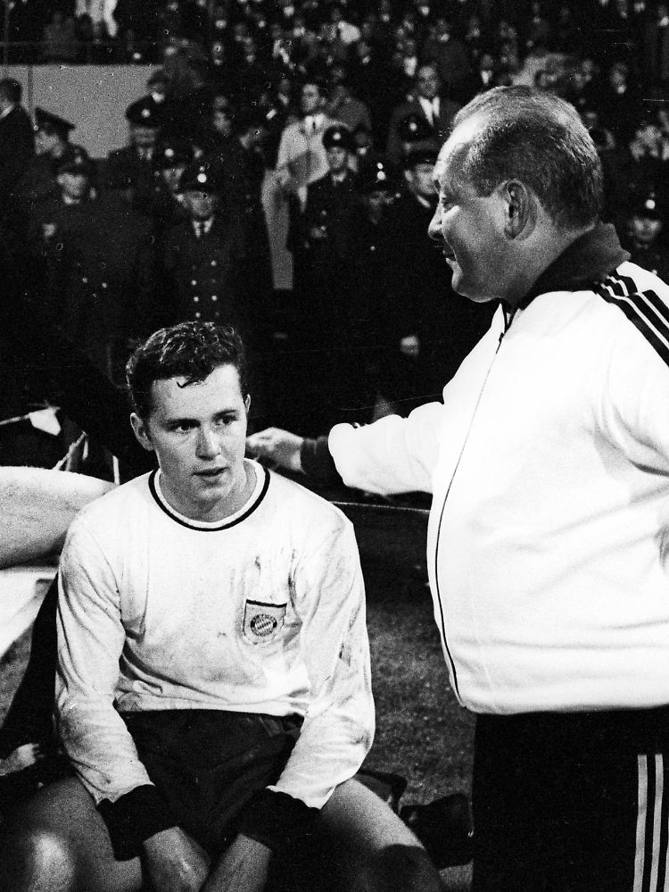 Der Kaiser und sein Trainer: Beckenbauer und Tschik Cajkovski am 31. Mai 1967. Im Finale zu Nürnberg ging es gegen die Glasgow Rangers um den Europapokal der Pokalsieger, das Foto wurde in der Pause vor der Verlängerung aufgenommen. Am Ende gewann der Fc Bayern mit 1:0.