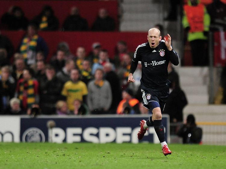 Ein Schuss für die Ewigkeit: Arjen Robben kann sein Traumtor gegen Machester United in CL-Viertelfinale 2010 selbst kaum fassen.