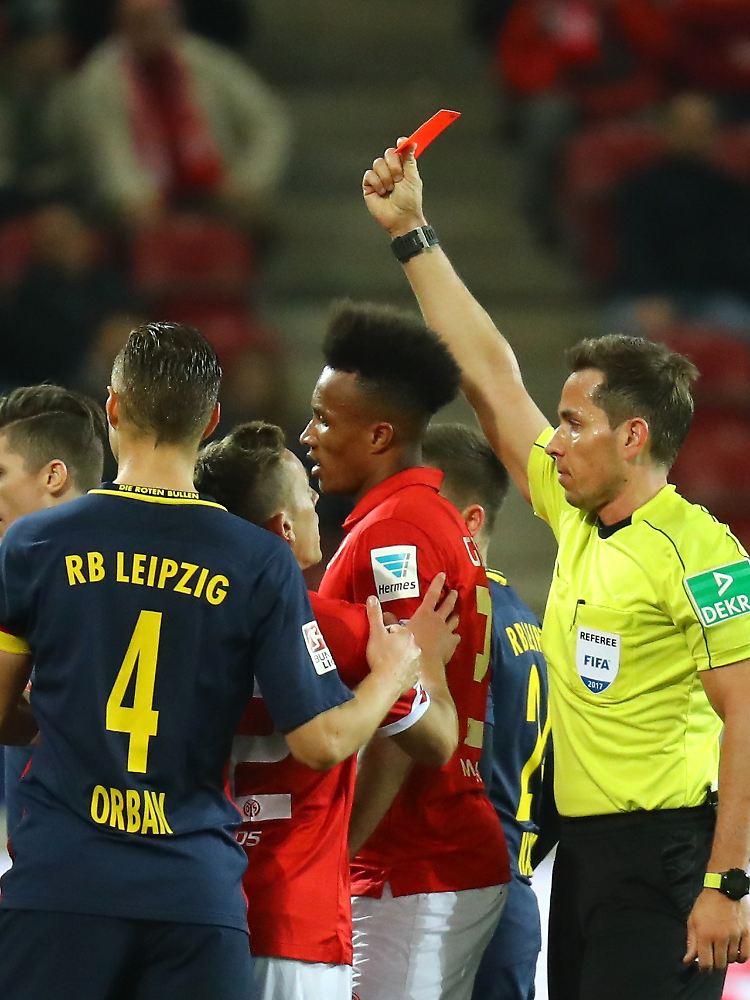 Wenn in einem Spiel der Fußball-Bundesliga gleich zehn Spieler verwarnt werden und einer vom Platz gestellt wird, kommen dafür im Wesentlichen zwei Erklärungen in Betracht: Entweder haben die Akteure munter drauflos geknüppelt - oder der Schiedsrichter war bei den Personalstrafen unangemessen kleinlich. Mit Blick auf die Partie am Mittwochabend an diesem 27. Spieltag zwischen dem 1. FSV Mainz 05 und RB Leipzig (2:3) muss man festhalten: Es waren die Spieler selbst, die für die kartenreichste Begegnung dieser Saison gesorgt haben. Sie ließen dem Unparteiischen Tobias Stieler schlicht keine andere Wahl, als gleich elfmal in die Brust- oder Gesäßtasche zu greifen.