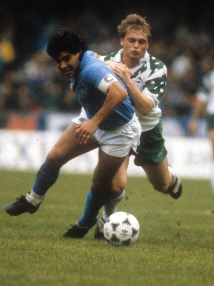 Gegen ihn habe ich all das versucht, in die Waagschale zu werfen, was geht. 90 Minuten kämpfen, rennen, ihn kratzen, ihn festhalten - aber das geht gegen Maradona nicht. Maradona ist der begnadetste Fußballer, gegen den ich dreimal in meinem Leben spielen durfte. Ich bin fast vor Ehrfurcht erstarrt. Okay, dann habe ich ihn zwei-, dreimal weggegrätscht, sodass er mich blöd angeguckt hat. Aber ausschalten kannst du einen Maradona nie ganz.