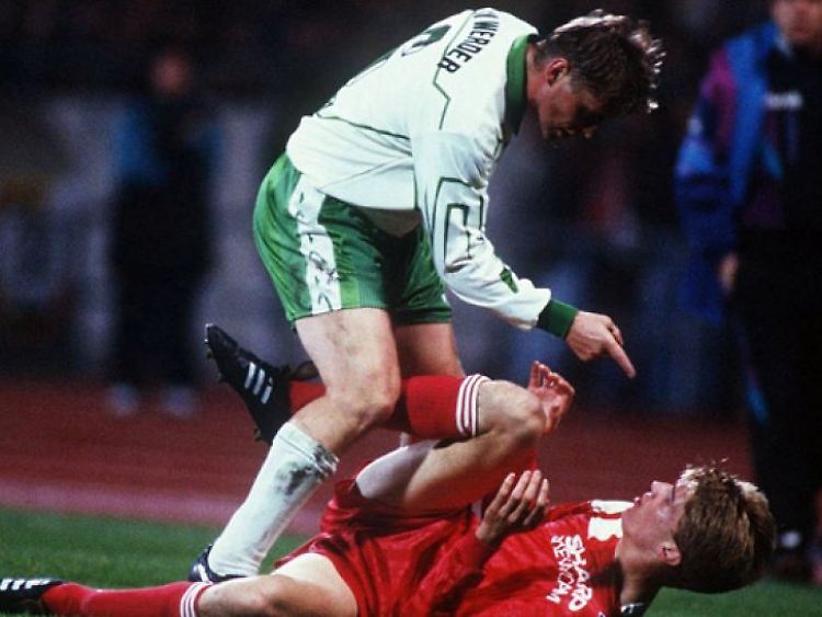 Ich habe das große Glück gehabt gegen viele Große zu spielen - Marco van Basten, Diego Maradona und George Weah. Beim Europapokalendspiel mit Werder Bremen gegen den AS Monaco war mein Gegenspieler George Weah. Zu der Zeit vielleicht einer der drei Topstürmer in Europa. Er war meine Aufgabe. Der Trainer hat natürlich einige Anweisungen gegeben - der ist kopfballstark, der ist zweikampfstark, schnell und beidfüßig. Naja, da war der Kopf schon voll als Abwehrspieler (lacht). Und du musst dann schauen, wie kannst du ihn aus dem Spiel nehmen. Kannst du ihn vollquatschen, wie du das mit vielen Bundesligaspielern machen konntest, so dass die dann die Konzentration verlieren? Das ging aber bei ihm nicht. Also musstest du versuchen mit Zweikampfhärte zu agieren. Aber das ging bei ihm auch nicht. Der hat sich nicht einmal geschüttelt. Aber ein Trainer hat nie gefordert, dass du da was machen sollst. So etwas gab es nicht. Und den Vorsatz jemanden zu verletzen, sodass er monatelang ausfällt, schon einmal gar nicht. Ich war sicherlich ein harter Knochen, aber bewusst jemanden verletzen? Nein, das ist weit weg gewesen.