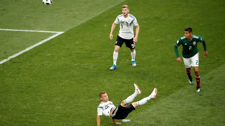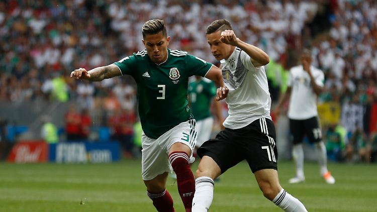 Timo Werner: Sein WM-Debüt feierte auch der 22 Jahre alte Leipziger, den Kollege Kimmich in dieser Woche als "Waffe" gelobhudelt hatte. In seinem 15. Länderspiel agierte Werner wie erwartet als Mittelstürmer, aber sein neuntes Tor im Trikot der Nationalmannschaft blieb ihm verwehrt. Dabei hatte er gleich zu Beginn die Chance, als er nach Pass von besagtem Kimmich den Ball flach aufs Tor schoss - aber eben auch daran vorbei. Eine stärkere Szene hatte er nach 20 Minuten, nach Kimmich-Lupfer setzte er sich gut im gegnerischen Strafraum durch, hätte dann aber besser auf Draxler gepasst, als selbst zu schießen. Eine Gelegenheit hatte er noch, in der 68. Minute. Diesmal flog der Ball weit über das Tor hinaus. Fazit: Er ist immer noch schnell. Aber natürlich stellt sich die Frage, ob der noch sehr junge Mann all die Hoffnungen, die auf ihm ruhen, auch bei einer Weltmeisterschaft erfüllen kann. Hinterher gab er sich betont gelassen, sein Motto: "Keep cool." Klar sei er enttäuscht, aber noch sei nichts verloren: "Wir sind Deutschland, wir wollen jedes Spiel gewinnen." Vier Minuten vor dem Ende der regulären Spielzeit kam für ihn der 22 Jahre alte Leverkusener Julian Brandt in die Partie. Und drei Minuten später lieferte er in seinem 17. Länderspiel den Beweis, dass bei allen Unzulänglichkeiten seines Teams auch ein wenig Pech im Spiel war: Von Strafraumgrenze schnibbelte er den Ball aufs mexikanisches Tor, der der küsste nur den Außenpfosten. Touché.