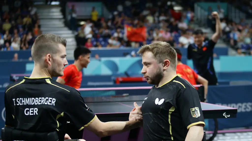 Gekämpft, nie aufgegeben, aber doch ohne Chance auf Gold: Die Tischtennis-Europameister Valentin Baus und Thomas Schmidberger haben bei den Paralympics in Paris die Silbermedaille im Doppel geholt. Das Duo von Borussia Düsseldorf unterlag im Finale der Startklasse MD8 den favorisierten Chinesen Cao Ningning und Spitzenspieler Feng Panfeng mit 0:3 (9:11, 5:11, 5:11). Baus und Schmidberger sorgten damit für die zweite Silbermedaille für den Deutschen Behindertensportverband (DBS) bei den Sommerspielen. Am Vortag hatten schon Stephanie Grebe und Juliane Wolf an der Platte in der Doppel-Startklasse WD14 Silber geholt, auch die WM-Zweiten mussten sich einem Duo aus der Tischtennis-Festung China geschlagen geben. Bisher gingen alle drei Tischtennis-Goldmedaillen aus Paris ins Reich der Mitte.