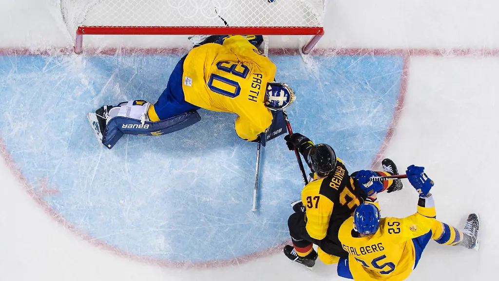 Nur: Zu sehen war davon auf deutscher Seite zunächst gar nichts. Mit Beginn des Olympia-Viertelfinals taumelte das Sturm-Team in ein schwedisches Schlagschussgewitter. Von links, von rechts, von der blauen Linie, aus der Box - der Puck flog im wilden Akkord auf das Gehäuse von Goalie Danny aus den Birken. Der parierte mit allem, was er hatte, mit Schoner, Stock, Fanghand.