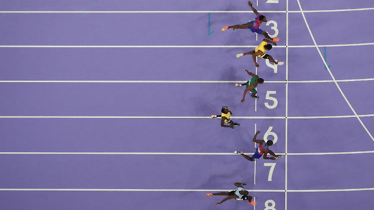 Schon die Inszenierung ist dramatisch. Plötzlich wird es im knisternden Stade de France dunkel, plötzlich sorgen nur noch kleine, geschwenkte Lichter auf den Zuschauerplätzen für ein wenig Helligkeit. Dann bricht eine Laser- und Technoshow los. Der DJ lässt das gigantische Stadion beben. Es sind die letzten Minuten vor dem Start der 100 Meter. Gesucht wird wieder der schnellste Mann der Welt. Gesucht wird der Nachfolger von Olympiasieger-Sensation Marcell Jacobs aus Italien. Der Titelverteidiger ist dabei, hat sich ins Finale aber reingezittert. Ein Kandidat für Gold, für eine nächste Überraschung ist er nicht. Aber wer ist eigentlich der Favorit?