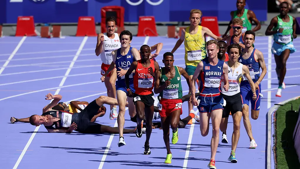 "Wir sind alle wie Kegel umgefallen": Nach einem Gerangel auf der Zielgeraden stürzen bei einem 5000-Meter-Vorlauf bei den Olympischen Spielen einige Athleten im Stade de France. Nach dem Rennen gibt es Zoff, doch am Ende steht ein Happy End.
