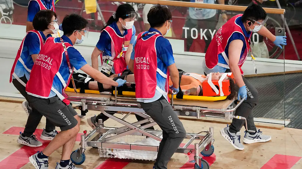 Bahnradfahrerin Laurine van Riessen touchiert im Kampfsprint das Hinterrad von Weltmeisterin Emma Hinze und stürzt. Schwer verletzt mit einem Schlüsselbeinbruch, gebrochenen Rippen und einer Lungenquetschung muss sie auf einer Trage abtransportiert und direkt ins Krankenhaus eingeliefert werden.