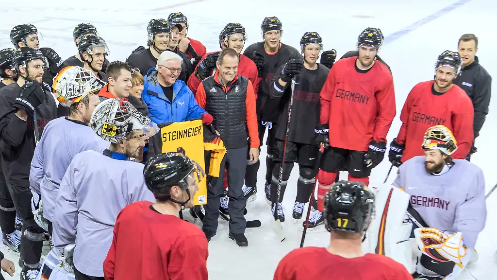Nach der Übungseinheit in der Trainingshalle der Olympia-Arena stellte sich der Bundespräsident mit seiner Ehefrau Elke Büdenbender und DOSB-Präsident Alfons Hörmann auf dem Eis inmitten der deutschen Mannschaft zum Foto auf. In den Händen hielt er ein DEB-Trikot mit der Rückennummer 1. "Ich weiß nicht, ob da ein Hintergedanke war. Schwer zu sagen", witzelte Angreifer Felix Schütz mit Blick auf die noch ungeklärte Torhüterfrage im deutschen Eishockey-Team.