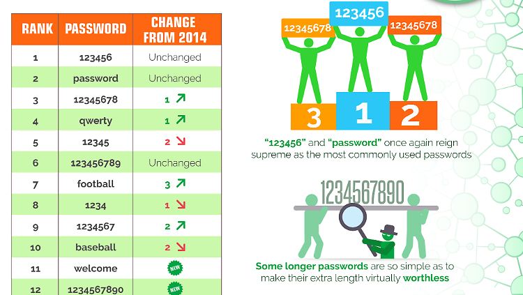 Wie schon in den Vorjahren stehen "123456" und "password" unangefochten auf den beiden Spitzenpositionen. "12345678" hat sich um einen Platz verbessert und belegt nun den Bronze-Rang. Die Blechmedaille gehört "qwerty", die ersten sechs Buchstaben auf der englischen Tastatur konnten sich ebenfalls um einen Platz steigern. Für "12345" zeigt sich dagegen ein klarer Abwärtstrend, die Kombination fällt vom dritten auf den fünften Rang. Vielleicht wird jetzt häufiger eine mindestens sechsstellige Eingabe gefordert.