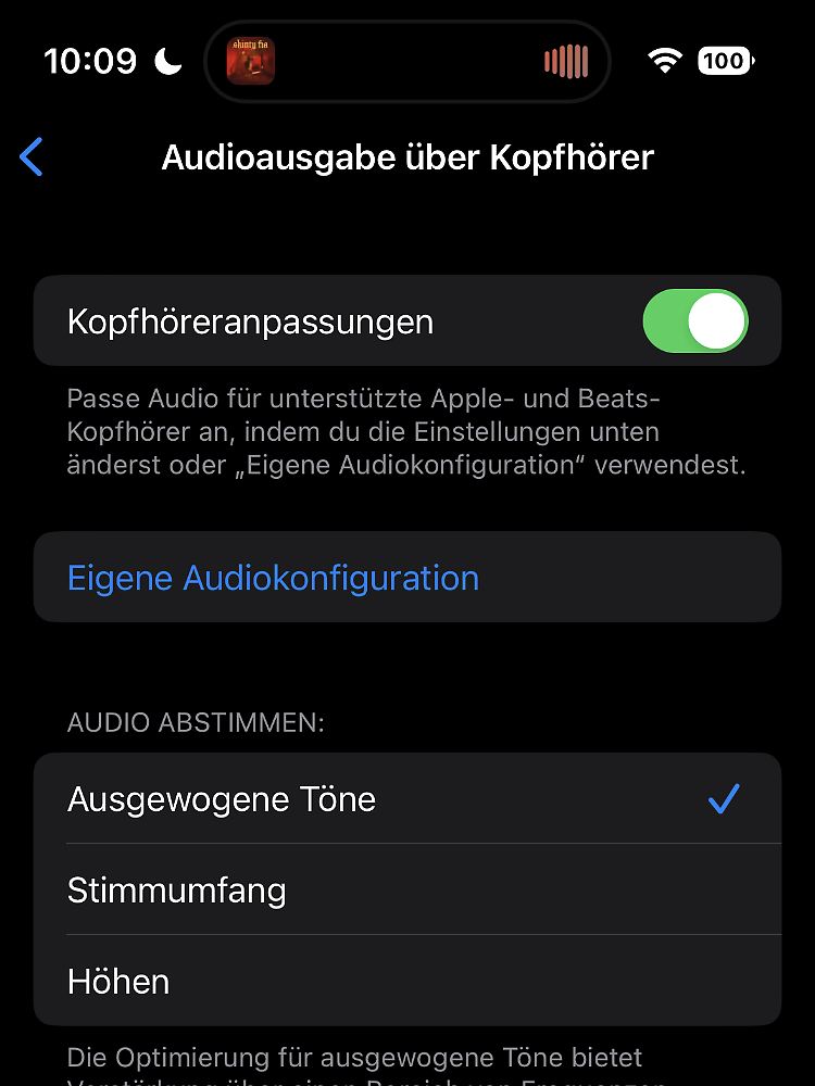 Klanganpassungen sieht Apple eigentlich nicht vor, aber etwas weiter unten, nämlich unter Audio/Visuelles gibt es die Kopfhöreranpassungen. Hier kann man beispielsweise Stimmen oder Höhen betonen, und es gibt sogar eine Eigene Audiokonfiguration. Sie erlaubt es unter anderem mithilfe importierter Audiodiagramme den Klang an das eigene Hörvermögen anzupassen.