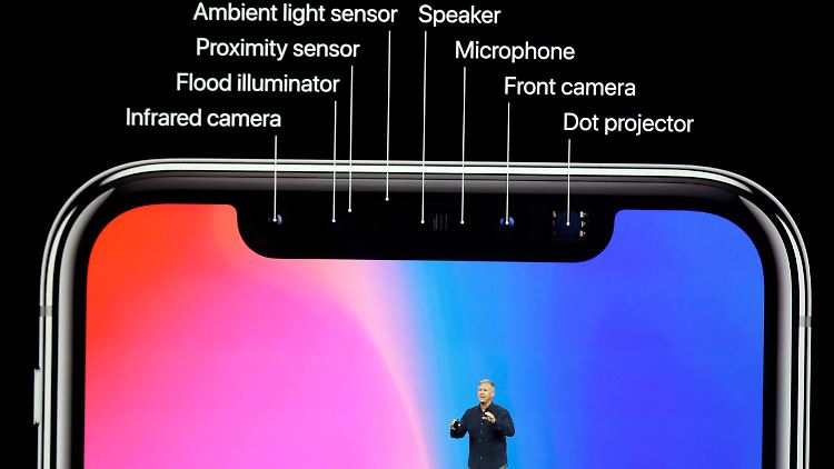 Statt Touch ID hat das iPhone X Face ID. Kameras und Sensoren, die auf der Vorderseite in einer knappen Display-Aussparung an der Oberseite sitzen, erstellen mit über 30.000 Punkten einen 3D-Scan des Gesichts. Im Dunkeln leuchtet zusätzlich ein Infrarot-Licht. Wie Huaweis angekündigter Chip Kirin 975 hat auch der A11 einen neuronalen Prozessor für maschinelles Lernen. Unter anderem soll Face ID so auch funktionieren, wenn ein Nutzer sein Aussehen verändert, beispielsweise eine Brille aufsetzt oder die Frisur wechselt. Durch die vielen im Chip gespeicherten Informationen soll Face ID auch sicherer als Touch ID sein. In Demos arbeitet es so schnell, dass kaum eine Verzögerung wahrnehmbar ist.