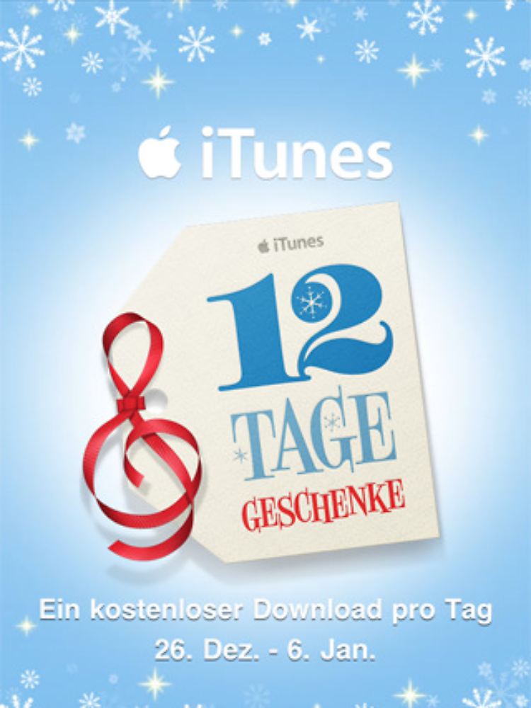 15.12.2010, 12:30 UhrWie im vergangenen Jahr startet Apple zu Weihnachten in seinem iTunes Store eine Geschenk-Aktion. Vom 26. Dezember bis 6. Januar gibt's täglich kostenlos Apps, Songs, iBooks und TV-Folgen. An einem Tag spendiert Apple auch ein Live-Video eines Konzerts der Fantastischen Vier. Die "12 Days of Christmas"-App steht bereits zum Download bereit.
