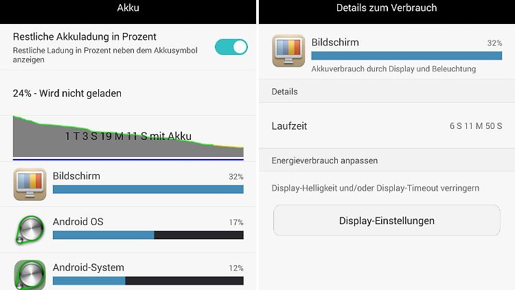 Eigentlich ist das Ascend Mate 7 wie alle Top-Smartphones für die meisten Alltagsaufgaben eher übermotorisiert, weshalb es standardmäßig im intelligenten Stromsparmodus läuft. Für Spiele und Online-Videos empfiehlt Huawei den Normal-Betrieb, für den Notfall gibt's auch einen Ultra-Modus. Der Laufzeit-Notfall dürfte aber beim Ascend Mate 7 nur höchst selten eintreten. Mit unveränderten Einstellungen war der Akku nach mehr als 27 Stunden Alltagseinsatz immer noch zu 24 Prozent gefüllt. Das Display war in diesem Zeitraum über sechs Stunden eingeschaltet. Zwei Tage ohne Steckdose sind also tatsächlich für das Mate 7 kein Problem. Klasse.