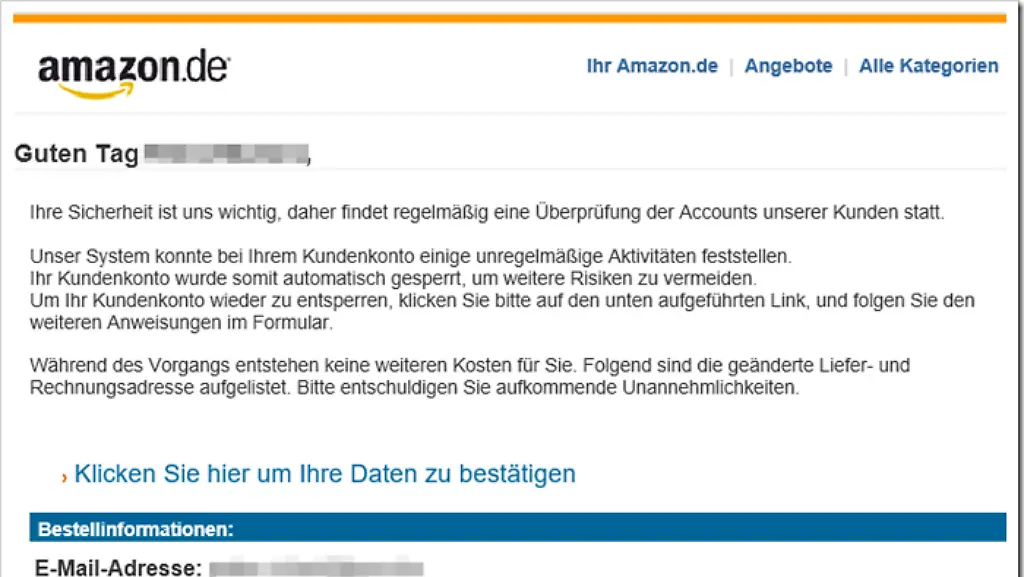 Dabei handelt es sich um eine angebliche Kundeninformation von Amazon.de, und auf den ersten Blick ist nichts Verdächtiges zu erkennen. Die Empfänger werden korrekt mit Vor- und Zunamen angeredet, Rechtschreib- und Formulierungsfehler finden sich nur bei genauem Hinsehen. Die Nutzer werden aufgefordert, ihr Kundenkonto wieder freizuschalten, nachdem es gesperrt wurde. Der Grund: "unregelmäßige Aktivitäten".