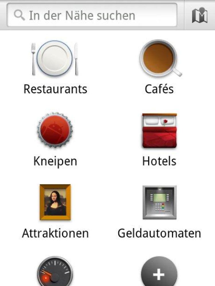 Nach einem Update von Maps über den Android-Market, findet sich in der App-Sammlung das tropfenförmige, rote Pin-Icon von "In der Nähe". Wenn man es antippt; öffnet sich ein Auswahlfenster mit häufig genutzten Suchbegriffen. Sieben von ihnen sind fixiert: "Restaurants", Cafès", "Kneipen", "Hotels", "Attraktionen", "Geldautomaten" und "Tankstellen". Der achte Begriff kann beliebig gewählt werden, indem man ihn nach einem Antipper des Plus-Icons eingibt. Durch eine längere Berührung des Icons kann man ihn löschen und durch einen anderen Begriff ersetzen.
