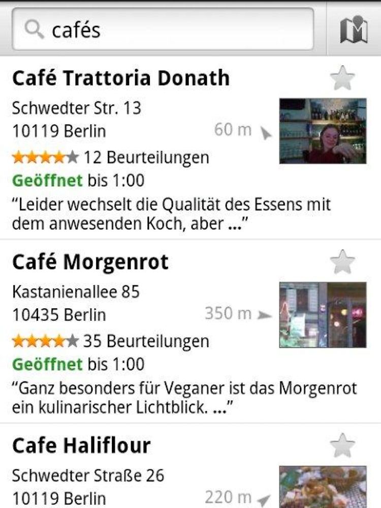 Beim Test klappte die Suche nach Cafés, Restaurants und ähnlichem sehr gut. Ein Reinfall war allerdings der Versuch einen Geldautomaten in der Nähe zu finden. Im Zentrum Berlins fand "In der Nähe" den nächstgelegenen Postbank-Automaten in Potsdam.