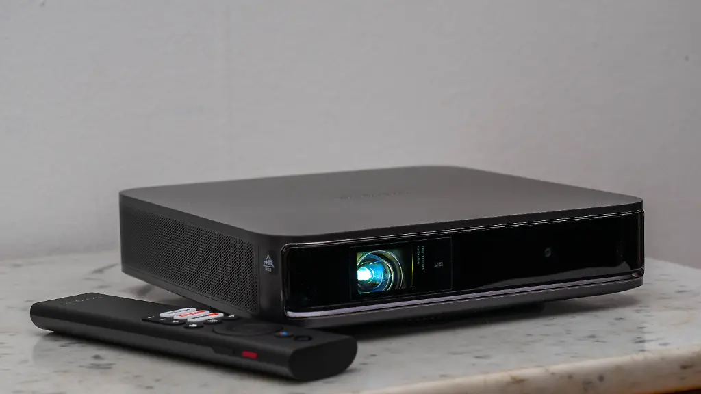 Wenn man ihn auspackt, ist man erst mal misstrauisch, denn mit lediglich 19,5 x 19,5 x 4,75 cm ist der knapp 1,3 kg leichte Projektor kaum größer als ein Taschenbuch. Trotzdem soll er mit ALPD-3.0-Lasertechnik ein starkes Bild mit bis zu 1200 ISO Lumen Helligkeit an die Wand werfen.